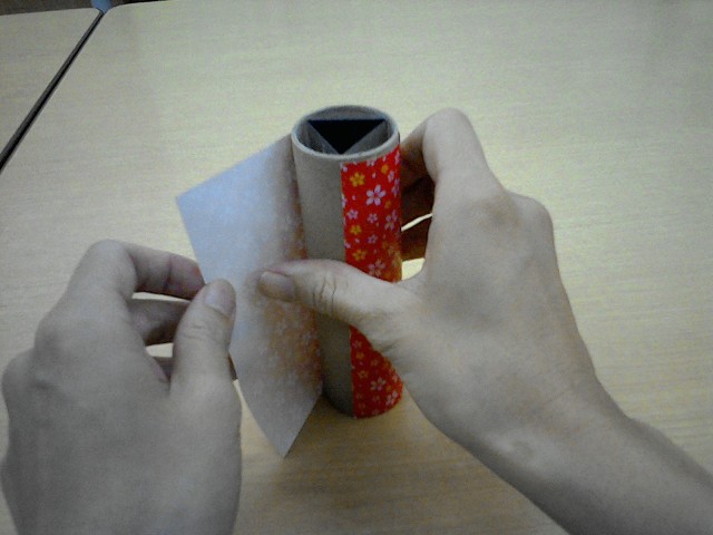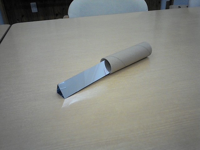 メッキシートを三角に組んでテープで止めてから、筒の中に入れます。