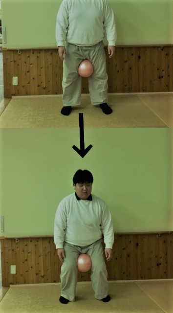最後はスクワットです。ボールを太ももの内側に挟みます。そのボールを落とさないように太ももの内側に力を入れ挟みます。立位が危険な場合は手摺等の支えを使用し転倒しないよう行って下さい。