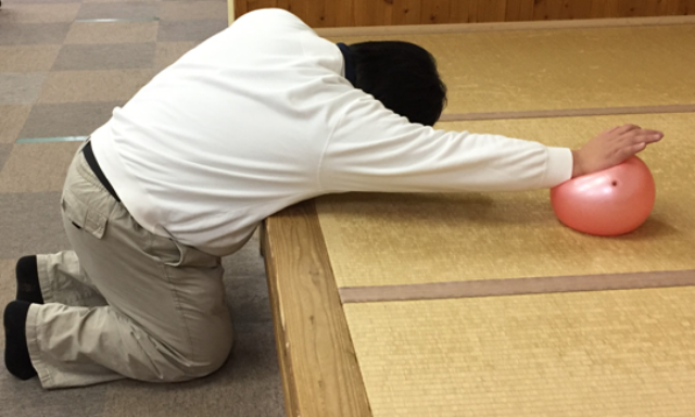 大きなボールを使用してのリハビリです。まずは上肢のストレッチです。床や机の上にボールを置き、転がすようにストレッチを行います。自分ひとりでは行いづらいストレッチもボールが転がることで簡単に行うことが出来ます。