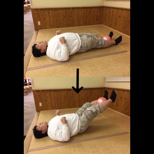 仰向けに横になった状態でボールをくるぶしあたりではさみます。そこから10~20cm程床から浮かせ10秒キープします。10秒キープが行えない場合は5秒、3秒と時間を短縮して行います。