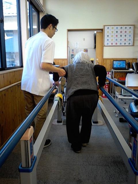 その他、移乗時のバランス機能・下肢筋力維持・向上の為、平行棒内での歩行訓練なども行なって頂いております。