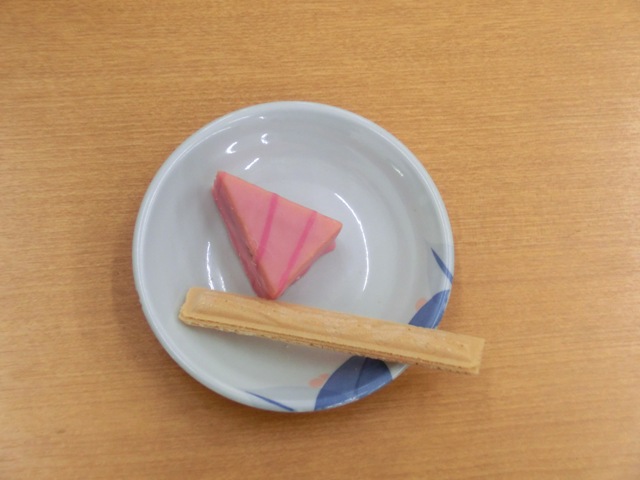 今回のおやつは、私オススメの『苺味のプチケーキと苺味のウエハース』をお出ししました♪甘酸っぱくて美味しかった!と皆さんとても喜ばれておりました(*^▽^*)スーパーでは『いちごフェア』ということで様々な苺味のおやつが並んでおりますので、気になる方は是非ご覧くださいませ。