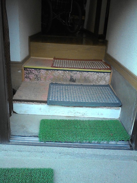 こちらが玄関の様子ですが、M様の要望として膝の疼痛緩和による玄関先の階段昇降が容易に出来るようにして欲しいとのことでしたので、要望に沿った機能訓練を提供させて頂きました。