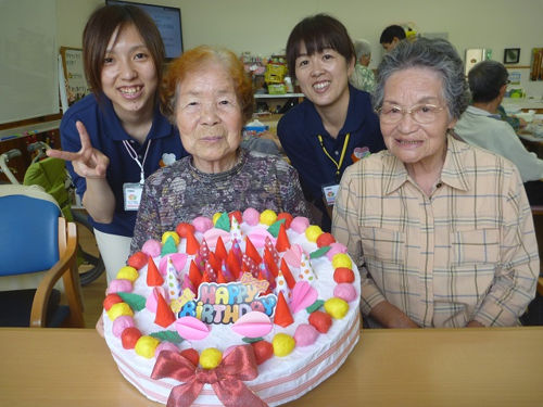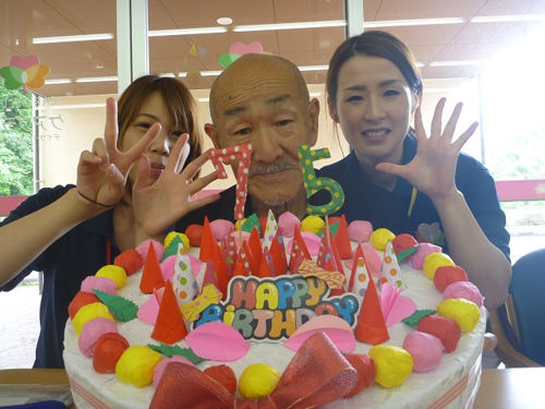 そこで、ケアプラス宇和島では特大のケーキとともに記念写真を撮り、皆さんの誕生日をお祝いしています♪