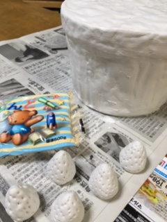 1:最初に円柱の箱に紙粘土をペタペタ貼り付けてケーキの土台を作ります。紙粘土を丸めてイチゴの形を作ります。爪楊枝を使って粒つぶを付けていきます。