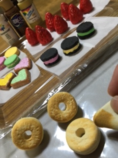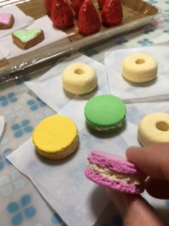 5:マカロンも作りました~。よりリアリティを出すため側面に爪楊枝で気泡を付けました。