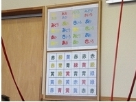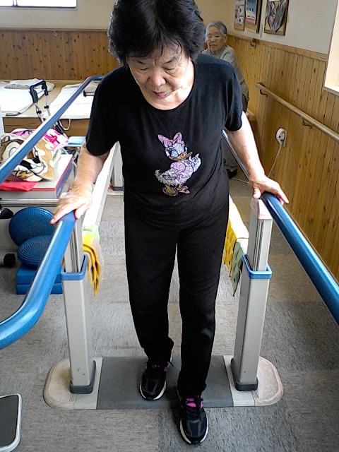 そこでY様には足を上げる感覚を取り戻して頂くため平行棒内歩行を行って頂きました。更には注意力向上目的のために平行棒内で歩きながらマルチタスクトレーニングも同時に行って頂きました。平行棒から見える位置にボードがあるのですが、そこに書いてある文字と色を識別しながら声に出して歩行することはY様も苦戦を強いられているようでした。