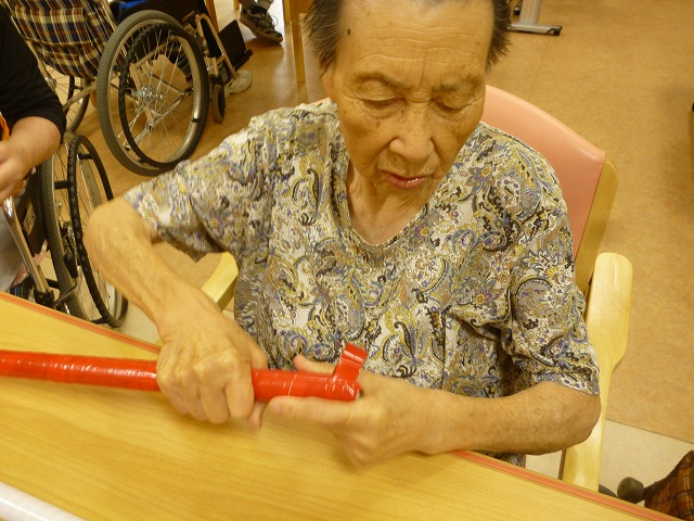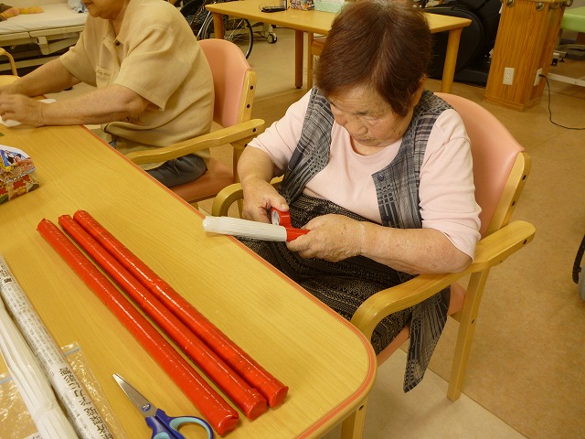 競技の一つ“大玉ころがし”で使用する棒をご利用者様と一緒に鋭意制作中!
