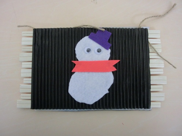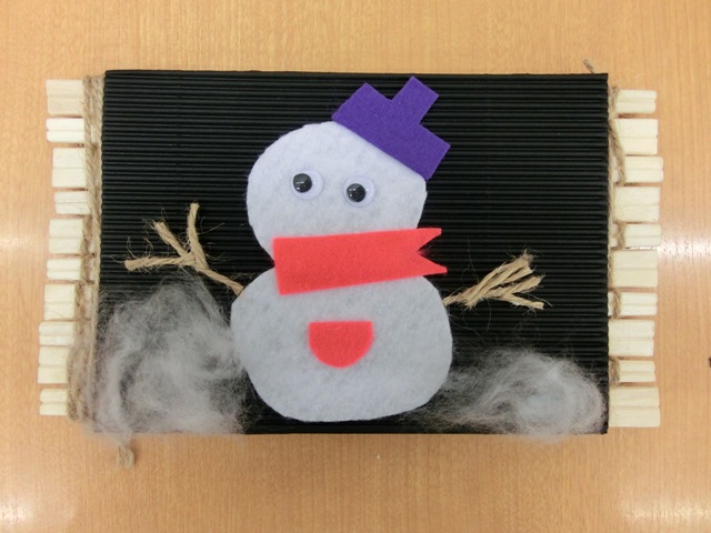 割り箸を紐で交互につなげる作業が意外と難しく、2月という事で雪だるまを作り、最後に写真を張ってみました!完成写真を貼っておきますが、私の不器用な部分が見えてくるかもしれません。綺麗に作れていますかね・・・?
