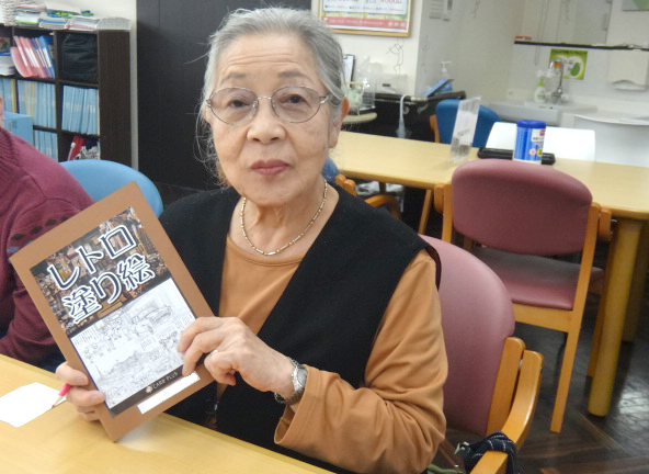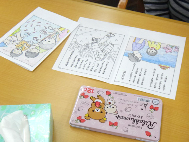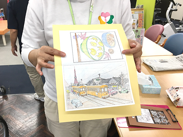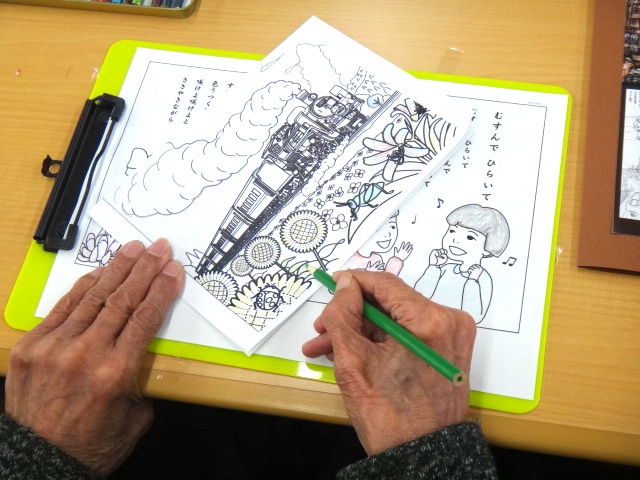 まずは、列車・動物・自動車・果物等のイラストが描かれた用紙を2枚ずつ選んで頂いた後、色鉛筆で自由な色付けをして頂きます。中には歌詞付きのイラストもあり、時折軽く口ずさみながら色付けをされている方もおられました。また、色塗りの見本がなかったため、隣席の方と色の構成を相談しながら作業をされている方もおられました。
