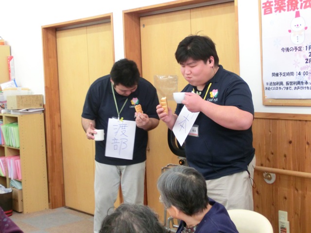 「節分イベント第2弾」では、恵方巻に見立てたフランスパンで職員が早食い対決をしました。昨年は実際に恵方巻を1本丸かじりを行い、私、渡部が一番早く食べ終わり見事優勝しました。さて、今年はケアプラス三津の横綱こと、柔道整復師の岡本が加わり混戦が予想されますが、果たして優勝は誰の手に!?