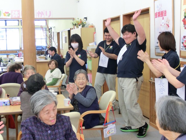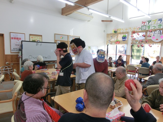 大きい鬼と細い鬼と小さい鬼の三人に皆さん一生懸命に玉を投げます!後から聞くと結構痛かったみたいです(^_^;) 利用者様からは「楽しかった」「えぇ運動になった」と大好評でした!