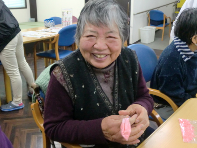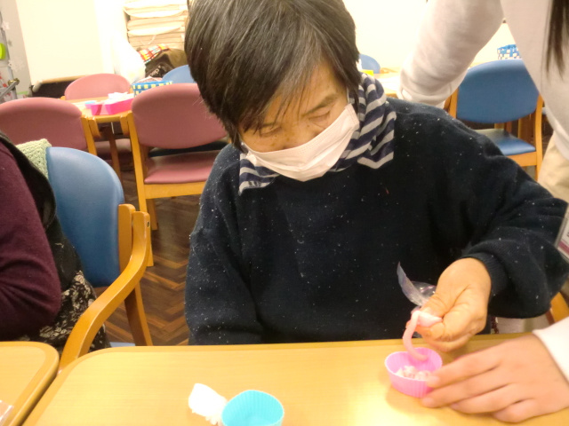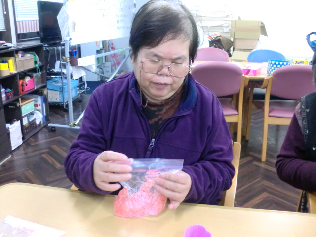 大切な方へ贈る「手作り石鹸」を作成して頂きました。色は赤とピンクです。皆様、初めての作業に「心うきうき」。まずは粉状の石鹸の中に少量のお湯を入れて、耳たぶくらいの硬さになるよう揉んでいきます。