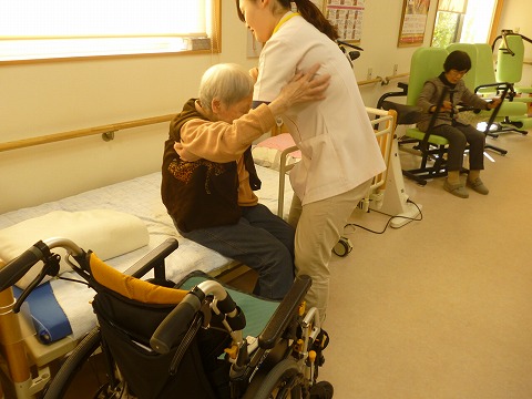 その他にも、靴を履くときに足を挙げてもらう、服の袖に腕を通してもらうなどご自身で出来ることは行って頂いています。