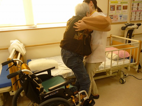 移乗動作においては以前は膝が伸び切らず、足の踏み変えも難しく介助者が抱え込むような状態でしたが、最近ではしっかりと膝が伸びており、介助量も以前と比べると軽介助で行えています。
