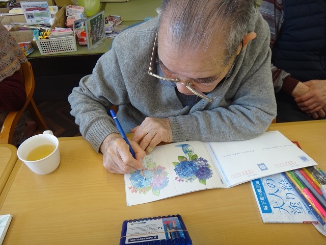 Sさんは毎回家から忘れることなく塗り絵帳と色鉛筆を持参されております。