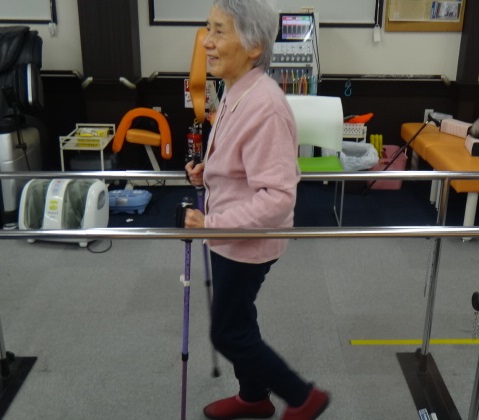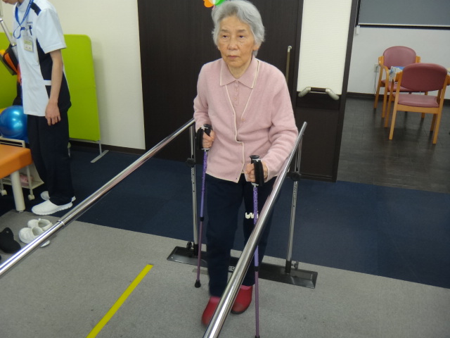 歩行動作の安定性向上目的で、平行棒内の歩行訓練を実施しました。歩行動作に必要な筋力を向上させるには歩くことが一番です。平行棒内などの安全な場所で大きく歩くことで歩行動作に必要な筋力が向上し、安定した歩行動作を獲得することができます。