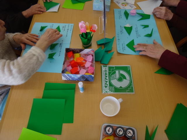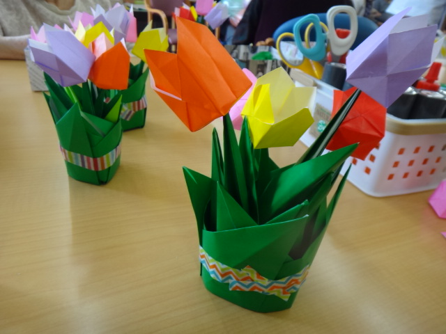 折り紙で作る立体のチューリップです。なんとすべて折り紙でできているんです!見本を見た皆様は「うわーかわいいねー!」「春らしくていいねー!」というお言葉を頂けました。