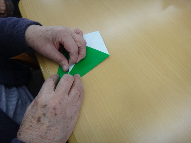 作り方を説明して、早速作り始めて頂きました。作り方見本を見るとすぐに「私は茎と葉を作ろうわい!」「じゃあ私は花を!!」