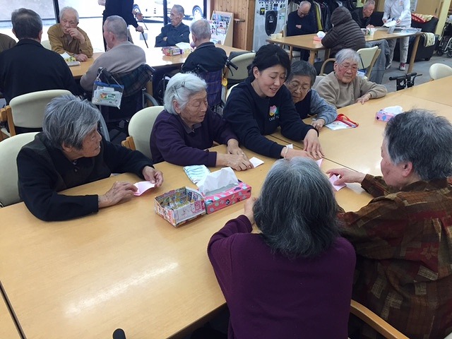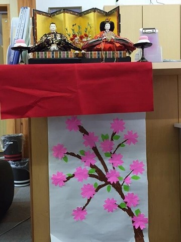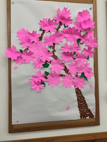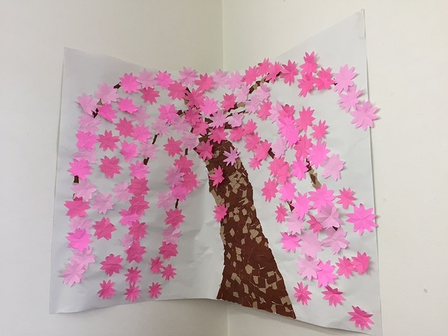 ケアプラス三津では毎日ご利用者と一緒に桜の花を作成しております。ご利用者が早く咲け、早く満開にしようとガンバタイムにせっせと折ってくれております。