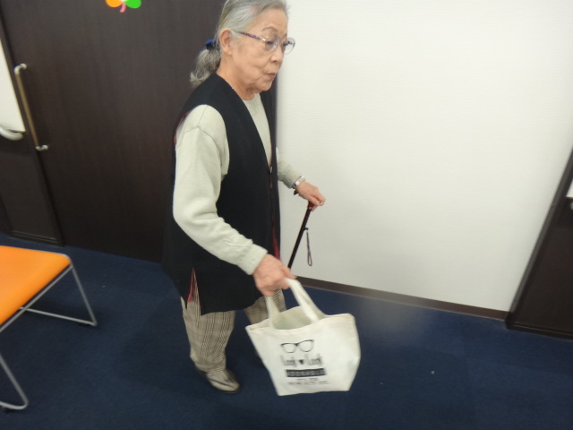 O様の場合は「近所のドラッグストアに買い物が行きたい」と仰っていましたので、ダンベルを袋に入れてもらい、自宅のスペースで写真のように歩行訓練を行って頂きました。バランス能力の維持向上を目指し実施して頂きました。