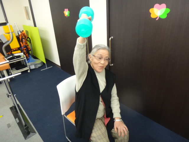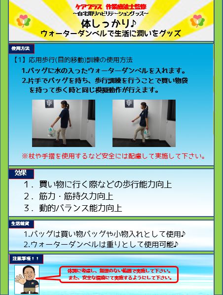 今回ご紹介する方はご自宅でも継続して運動を行えるようリハビリスタッフが企画した「体しっかり」リハビリグッズ11月号の「ウォーターダンベルで生活に潤いグッズ」を使用して意欲的に自主訓練して頂いている方です。