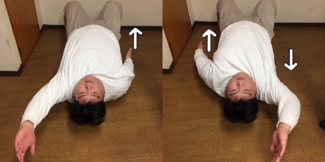 次は背泳ぎをするように手を上下に動かします。この時に右を上げる際には左を下ろし、左を上げる際には右を下ろす様に行います。腕が上がらない場合は行える範囲で行いましょう。