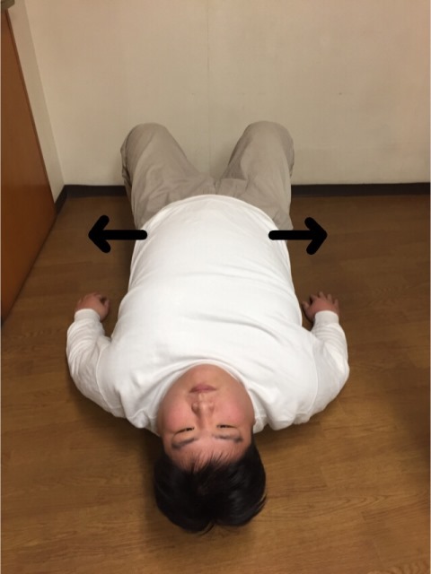 これはタオルケットにビニール紐を巻いたものですがこれが簡易ストレッチポールとなります。高さが足りない、硬さが足りない場合には丸める際にバスタオルを一緒に巻くと調整することが出来ます。このストレッチポールでの目的は腰痛改善、胸郭を広げることにより呼吸を楽に行えるようになります。