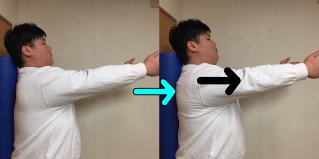 最後は肩甲骨を動かす運動です。腕を前になれをするように上げます。そこから肩甲骨を前に出すように動かし力を抜いて肩甲骨を下ろします。