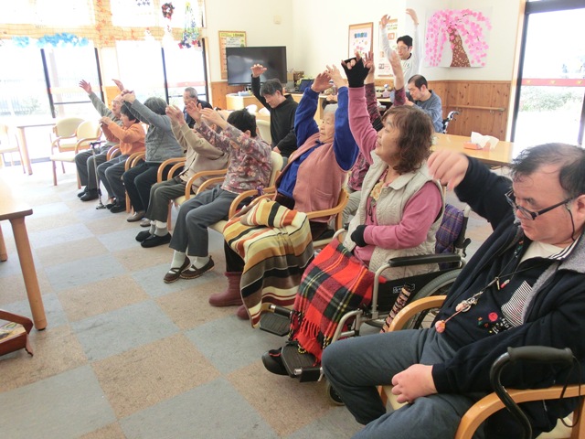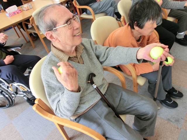 『春の小川』ではまるで川辺を散歩しているかの様な軽快な足体操を交え、『どじょっこ ふなっこ』ではテニスボールを使った手運動を行いました!普段の体操では滅多に使わないテニスボールに興味津々なご様子で取り組まれておりました(●^o^●)『おぼろ月夜』では歌詞の内容を全身で表現しつつ、歌いながら体操されました。この曲は皆さん馴染み深いためか、歌い終わった後にも名残惜しく口ずさむ方がいらっしゃいました!