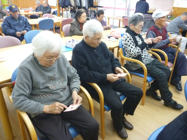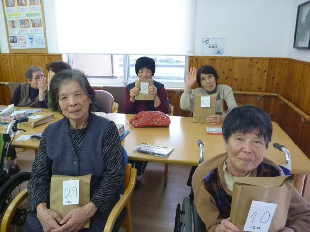 いざ、イベントの内容をビンゴ大会&抽選会と説明し、ビンゴカードと景品を準備しましたところ、景品を見たご利用者様の顔は笑顔半分もう半分は真剣そのもの!ビンゴカードに穴が開くほど数字とにらっめっこをされておられるご利用者様もおられました。