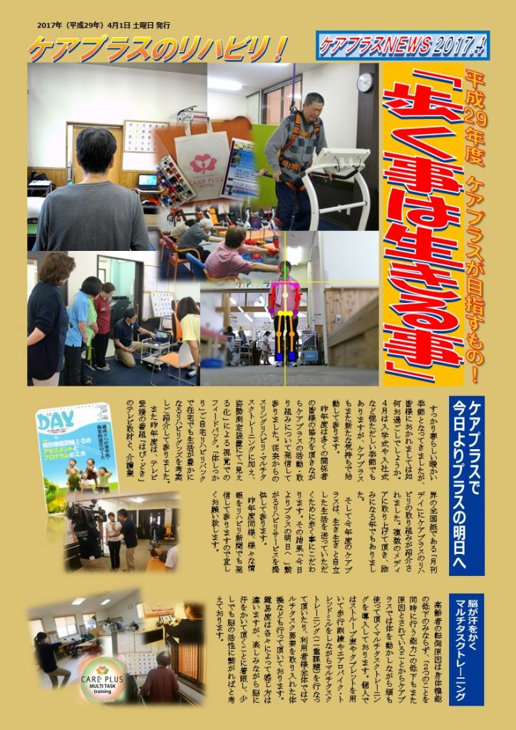 そして今年度のケアプラスは、生き生きと自立した生活を送っていただくために歩く事にこだわります。その結果「今日よりプラスの明日へ 」繋がるリハビリサービスを提供して参ります。昨年度同様、様々な情報をリハビリ新聞でも発信して参りますので宜しくお願い致します。