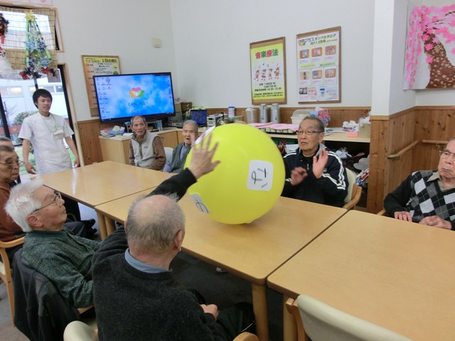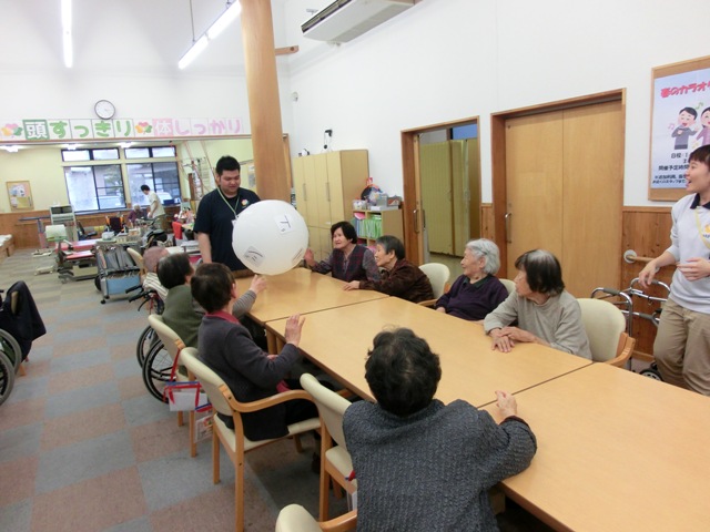 今回は、まず準備体操として「ヘルス体操」を先に利用者様に行って頂きました。体操後は男性・女性に分かれて頂き、協力しながら行うレクレーション「見ながら考えて大風船ホイホイ!」を実施しました。こちらは大きな風船に文字がいくつか書いてあり、それを弾きながら全員で何が書いてあるのか当てるレクレーション内容となっております。