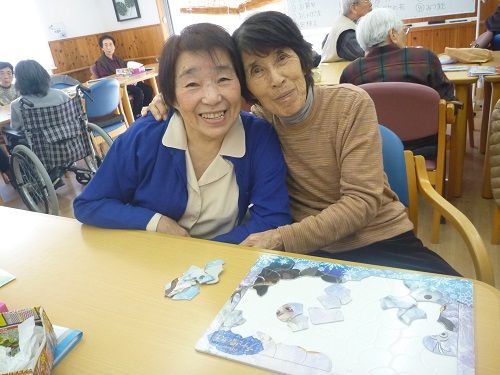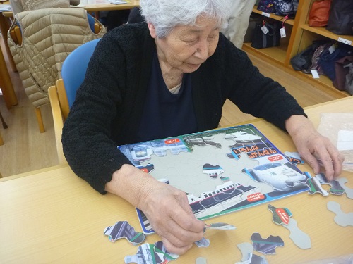 まず最初は、パズルをされている様子です。2人で協力したり、1人で集中して完成されたりと脳が活性化され、完成後には「頭スッキリ」します。簡単そうに見えて意外と難しいのです!パズルは評判が良く多くの方がされています。何気ないことが実は脳に刺激を与えているんですね!