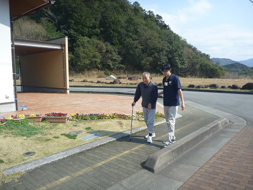 続いてはこちら!散歩をされている様子です。ケアプラス宇和島の周りは車の通りが少なく散歩には絶好の場所です!春の季節でポカポカ陽気!これからの散歩はとても気持ちいいですね。春の季節を感じながらリハビリもでき、「体しっかり」にも取り組めます。まさに一石二鳥です!