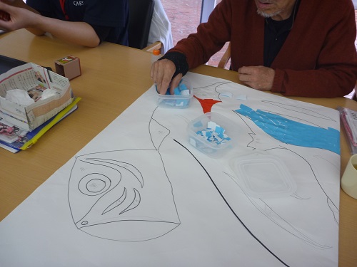 最後はちぎり絵カレンダーの作成している様子です。ご利用者様に一枚一枚丁寧に貼って頂いています。完成までにやりがいと、楽しみがあり「心がうきうき」しますね!