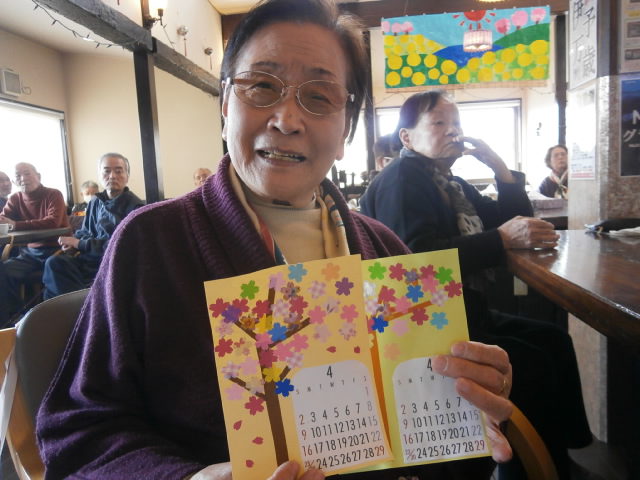 さてさて、本題に入りますね。まずはご利用者の皆様が午後のガンバクラブ活動で作成されたミニカレンダー工作です。先月は4月にご自宅で飾っていただこうと考えましたので、やっぱり絵柄は桜で決まりです!台紙に色紙で幹を貼り付け、枝と桜の形に切り抜いた色紙を好きなだけ貼っていただきました。
