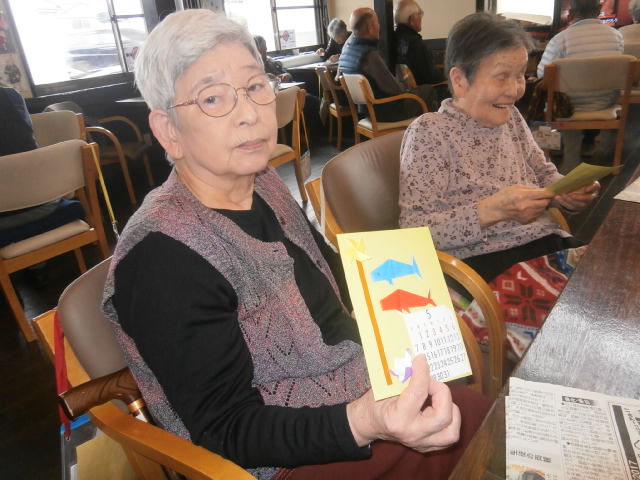 「折り紙をするのが好きなんよ。」と仰る方が、鯉のぼりを他の方の分まで沢山折って下さいました。「工作が苦手な方の分を代わりに作るよ!」と申し出て下さる方もいらっしゃって、沢山のミニカレンダーが完成しました。