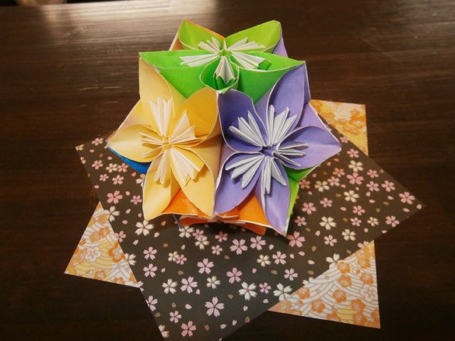 以前、折り紙工作でご利用者の皆様に花飾りを作っていただいた様子をブログで紹介しました。読んでいただけたでしょうか?実はその後、ステキな展開がありました。「あの折り方をもう一回教えて!」とおっしゃる方が何名かおり、再度折り方を説明しました。「あの花を沢山折って、球にして、つるし飾りにしたい。」と云う方々がいらっしゃったのです。その中のお一人が、出来上がった作品を持参され、見せて下さいました。そして「デイで飾って!」と申し出て下さったのです。「恥ずかしいから顔と名前は出さないでね。」との事でしたので、作品の写真だけ載せますね。
