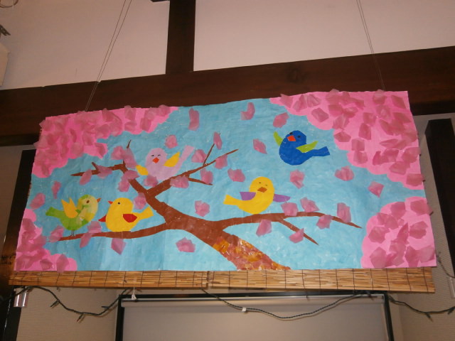 先月作成され、4月にデイのホールに飾られているのは、満開の桜の中で小鳥が遊ぶ絵柄の貼り絵です。