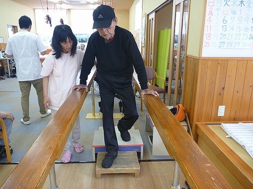 玄関の上がり框等段差に不安が多い為、ご自宅の段差に合わせた段差で、昇降時の足運びの順番を繰り返し訓練しています。