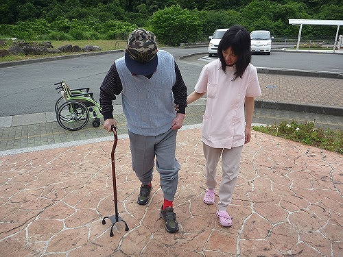 屋内は四点杖を使って歩行されているS様。家の庭を散歩したい…デイの敷地にある不整地での杖歩行訓練です。