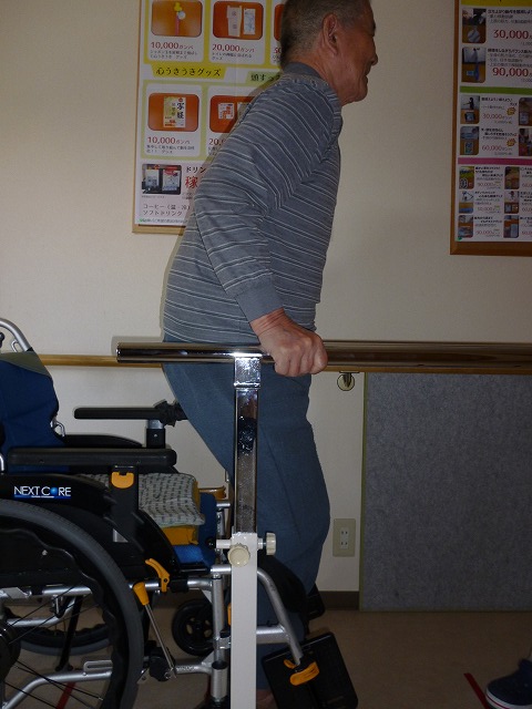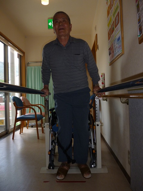 H29年5月より平行棒内での立位訓練を開始しました。現在、立ち上がり要介助。立位保持1分30秒程度。一番初めに「歩きたいんよ。」と話して下さいました。その一途な思いに便乗させて頂くことにしました。私達にできる全てのことを提供し、一緒に頑張って参ります。