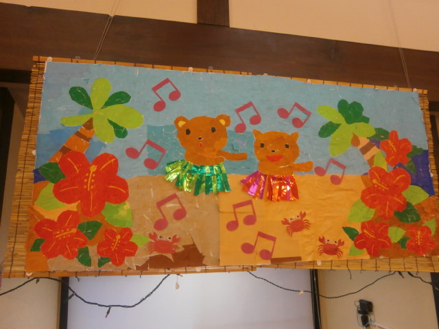 素敵に仕上がっていますね♪ホールを飾る貼り絵は、夏らしい絵柄のハイビスカス咲き乱れる作品です。