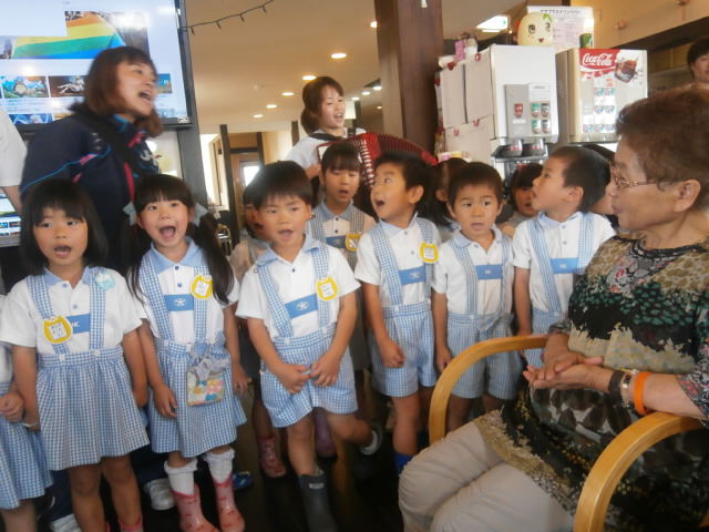 さて今回のブログでは、まず6月28日に行われた『木の実幼稚園 お楽しみ交流会』の模様を紹介します!今回は『れんげ組』30名のこのみっ子達がケアプラス垣生にやって来てくれました!沢山のちびっ子達の来訪に、ご利用者の皆様は満面の笑顔です。このみっ子達による踊りを交えた「朝の歌」「忍者の歌」から交流会は賑やかに始まりました!