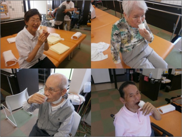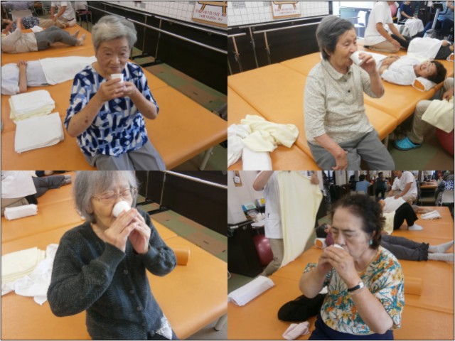 いい笑顔で一汗かいた後しっかりと水分補給されています。水分は1日に1.5リットルは何もしなくても汗や尿で出て行ってしまいます。補充しないと様々な臓器に影響が出て体調不良の原因の元になります。脱水症だけでなく、夏バテ予防のためにもしっかり水分補給をしていきましょう!