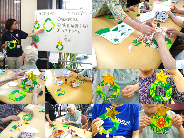 多くの利用者様は、リースに貼り付ける折紙の部品を隣席の方と相談・協力されながら製作をしておられました。個性あふれる作品が多数出来上がり、御利用者の皆様にもご満足頂けたイベントとなったようです。