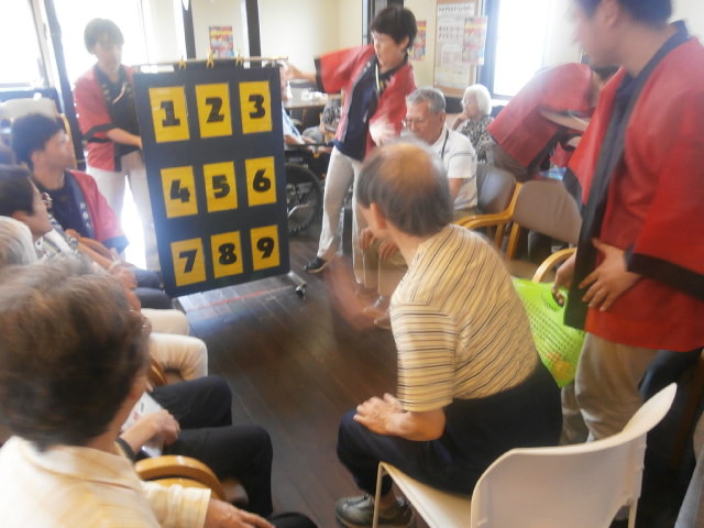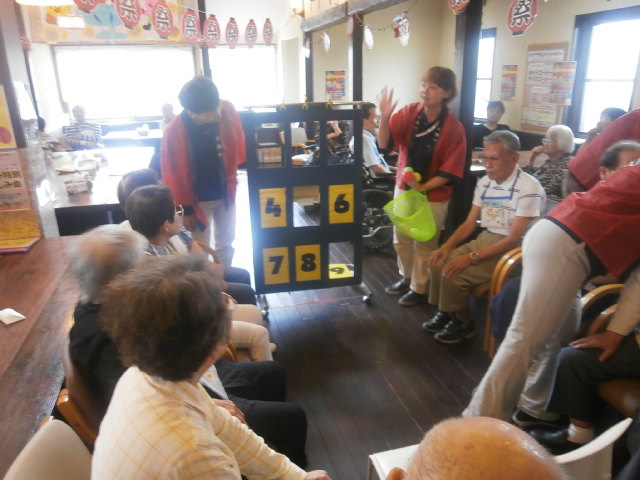 続いてイベントの紹介です。毎年、ケアプラス全事業所で行う恒例の心うきうき祭りが開催されました。垣生では8月9日に4チームに分かれて行いました。今回は射的、金魚&スーパーボールすくいに加え、新ゲームとしてストラックアウトが加わりました。それでは早速それぞれのゲームの紹介を行いたいと思います!