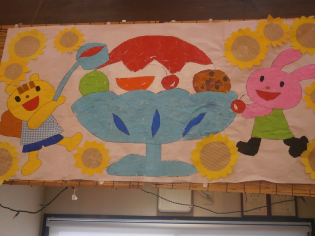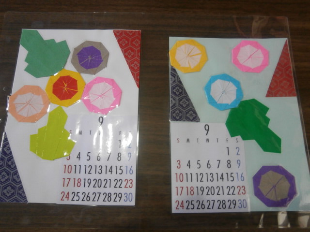 まずは作品紹介です。ちぎり絵と個人作成のカレンダーですが、どちらもかき氷や朝顔といった夏らしい絵柄となっています。