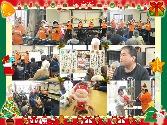 各曲ごとに異なった振付があり、何人かの利用者様は曲に合わせて手拍子・振付をしておられました。また、ある利用者様は思い出の曲の演奏が始まると口ずさみながらも感極まって涙されておられました。イベント後の感想では、『こんなええ音楽会があるんなら、また来たいわ♪』『ええ歌を聞かせてもろた♪』『色々と歌えてよかった!!楽しめた!!』など皆様にはご満足頂けた音楽会となりました。